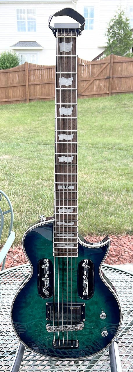 The smaller size and reduced weight of the headless guitar makes it a perfect travel companion. LTD introduced the diminutive EC-1, equipped with powerful humbucking pickups, as a travel guitar.